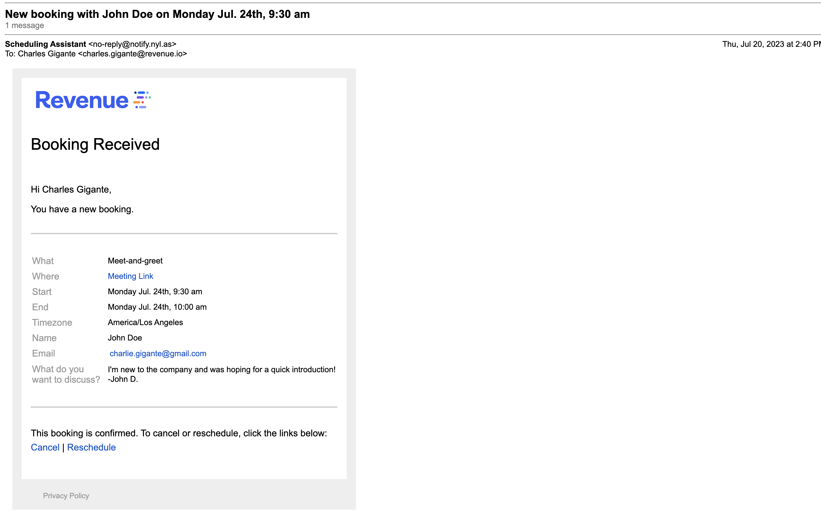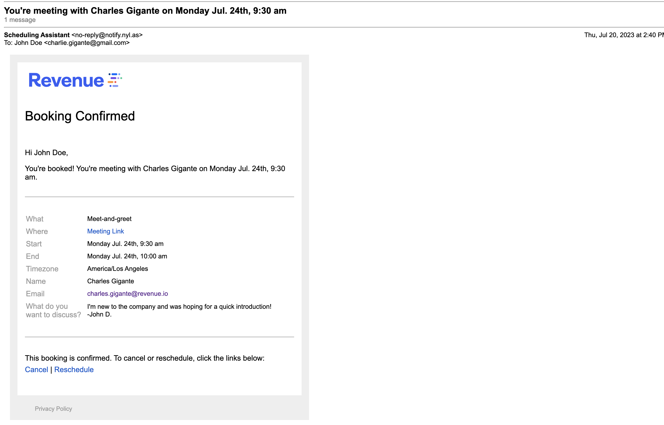 If the meeting host has enabled confirmation emails for both themselves and the meeting guest, then emails will be generated to both parties indicating that an event has been scheduled.