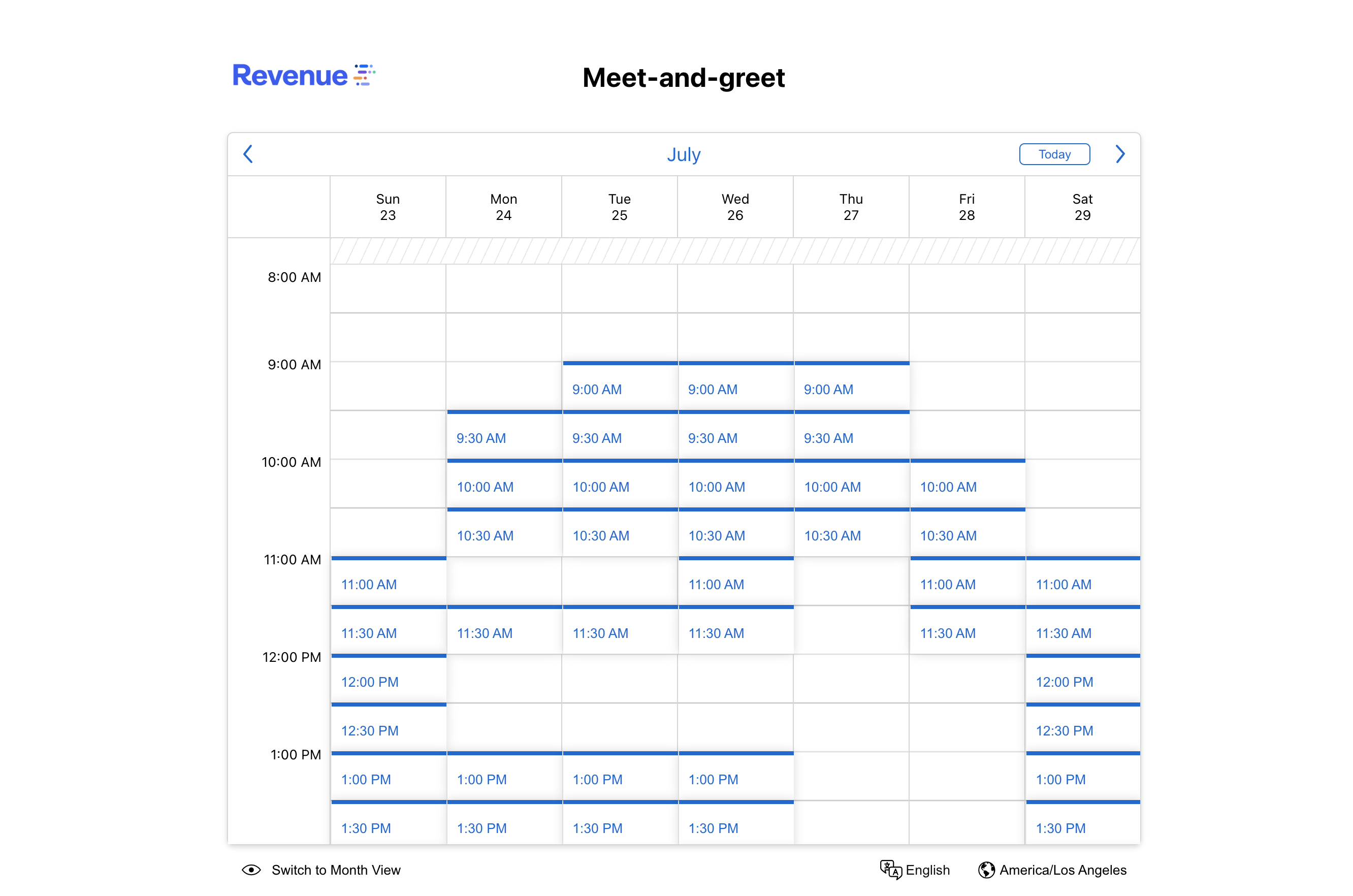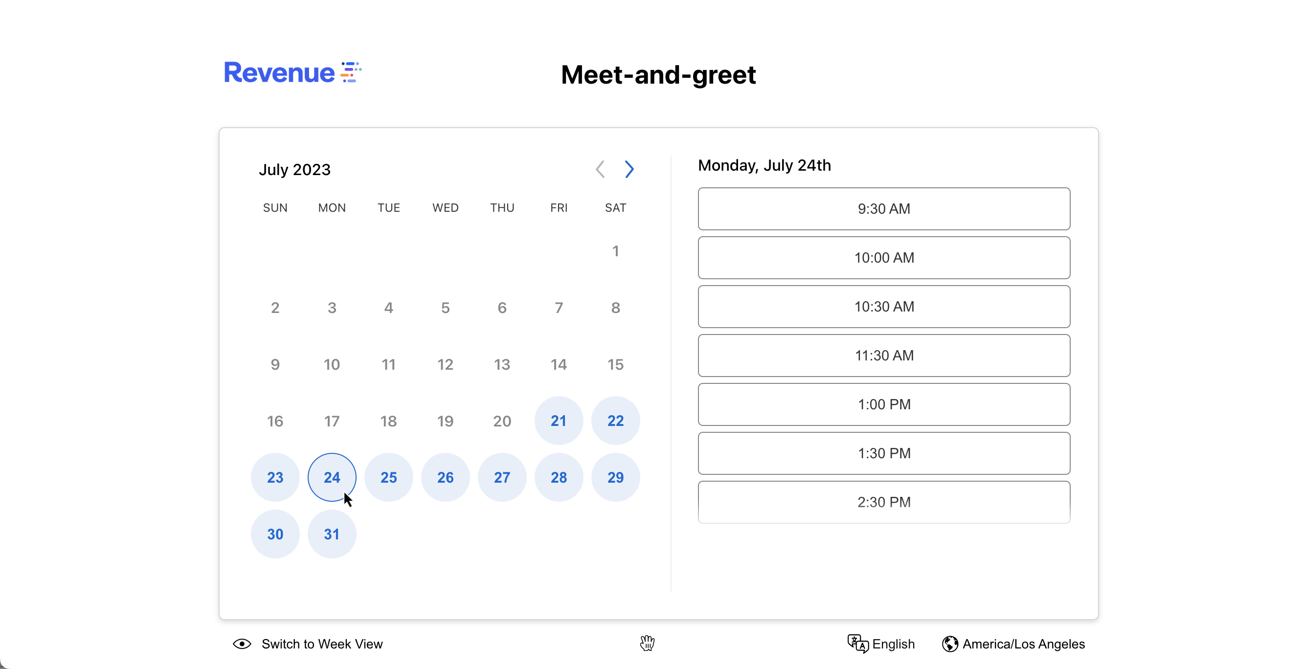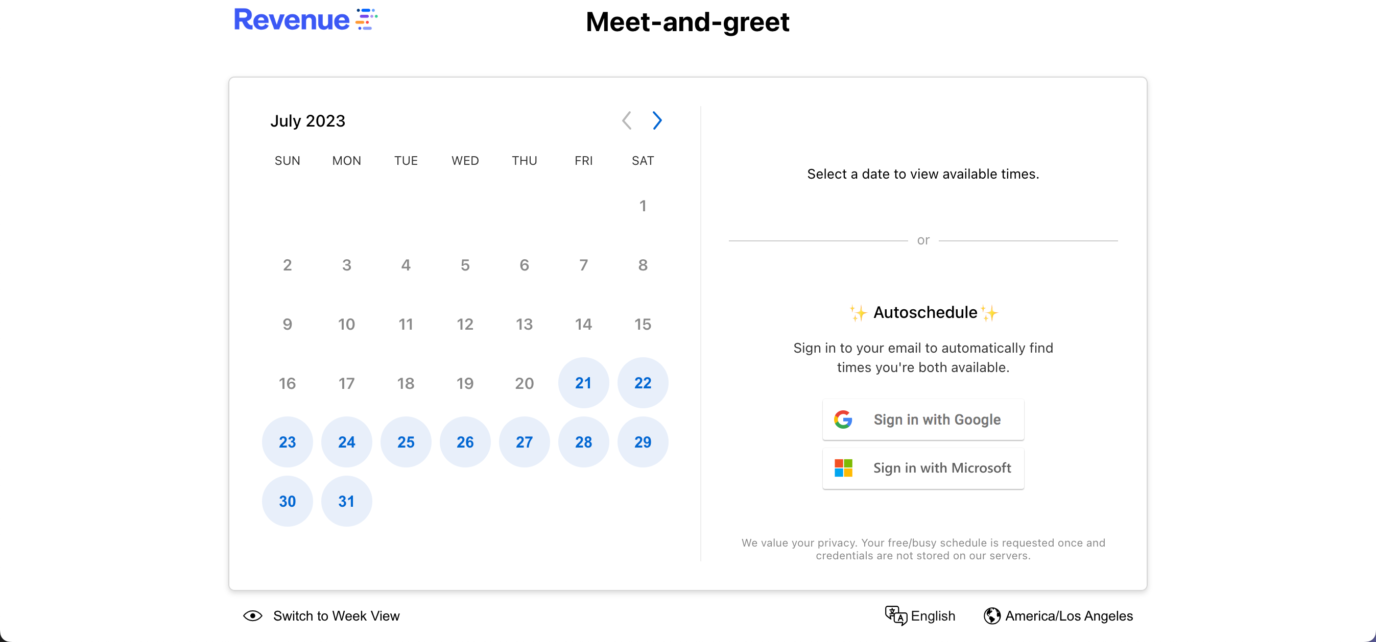 After clicking on the meeting type, users are navigated to a weekly view where the Calendar Owner’s next available times can be booked.