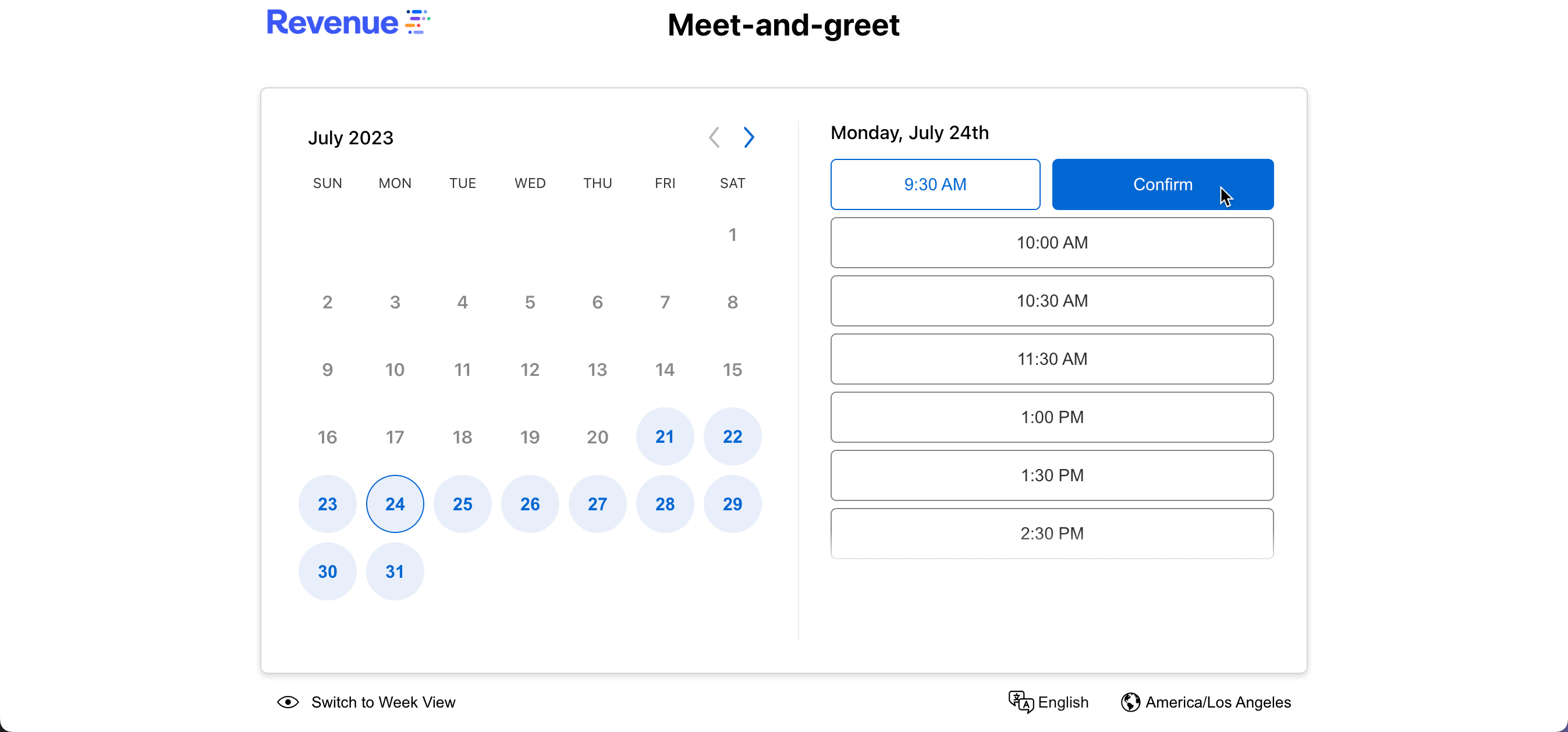 User clicks on a time and selects the “Confirm” button to proceed with booking: