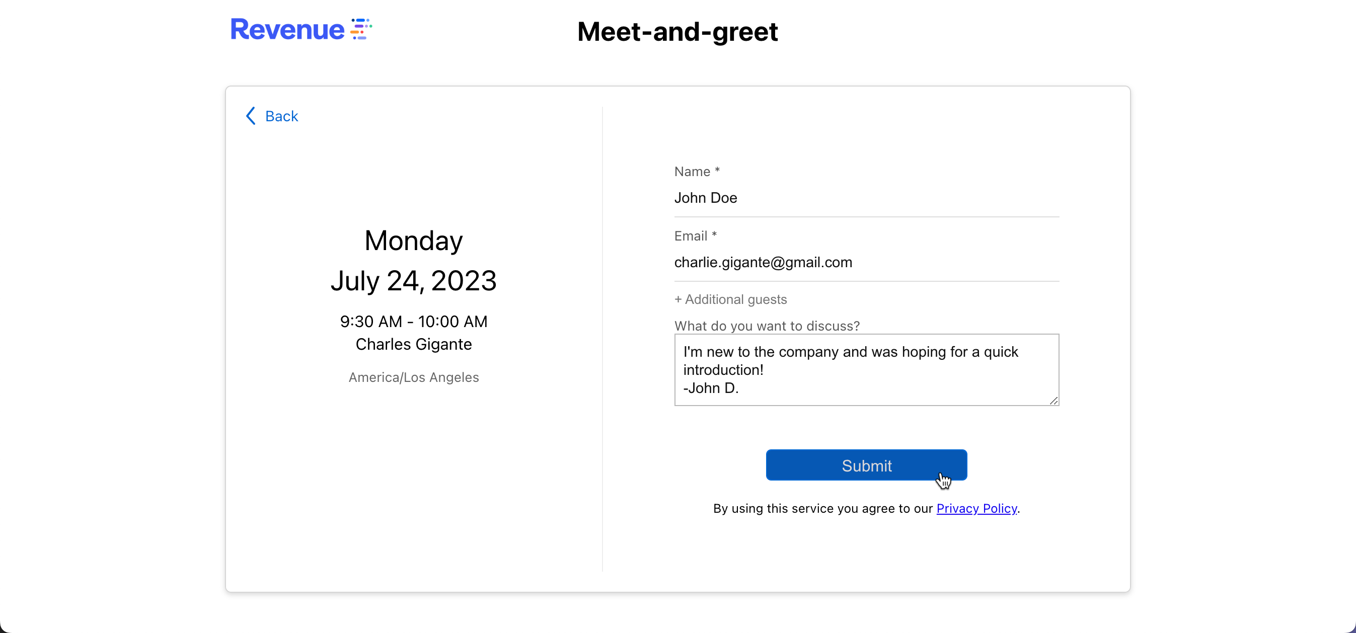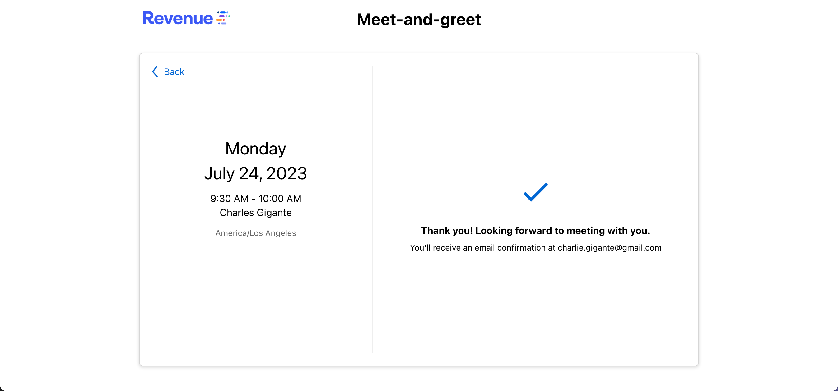 Calendar Booking is an appointment scheduling tool that eliminates the need for playing phone and email tag when attempting to schedule sales calls, product demos, etc. Simply send your Revenue.io Personal Calendar Booking Page URL to anyone, and they’ll be able to find open time on your calendar and schedule the event seamlessly.