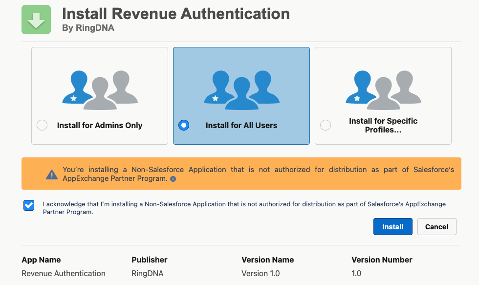 - Production: Install Revenue Authentication (production)