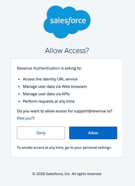 Install the Revenue Authentication package in Salesforce. It contains the new Salesforce External Client App.