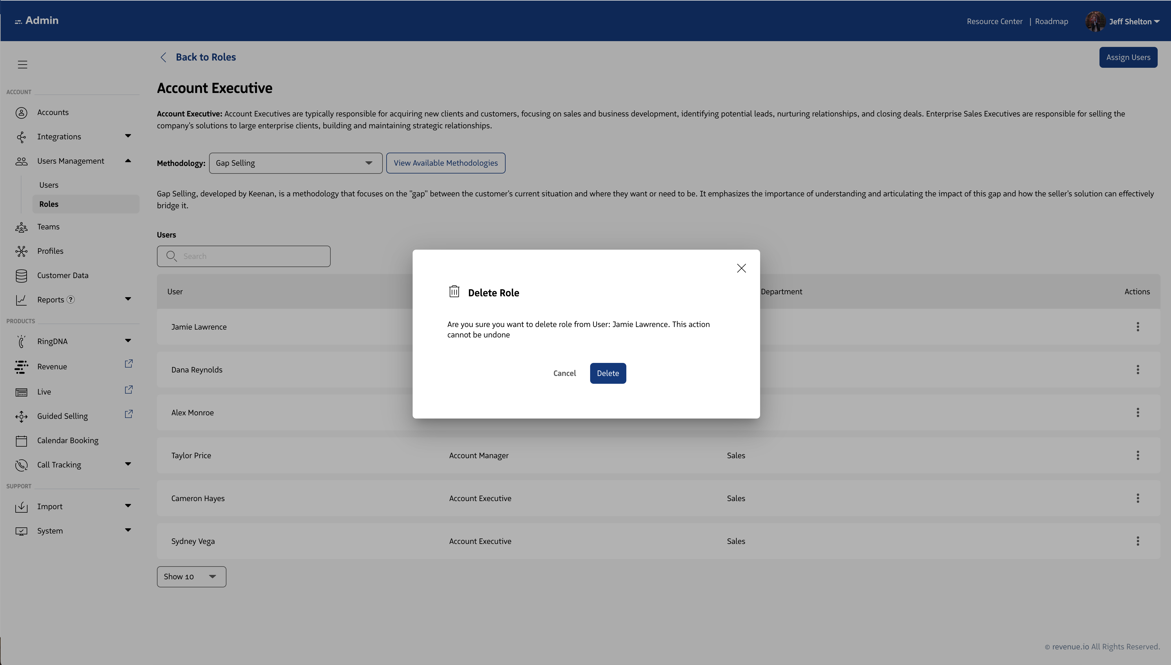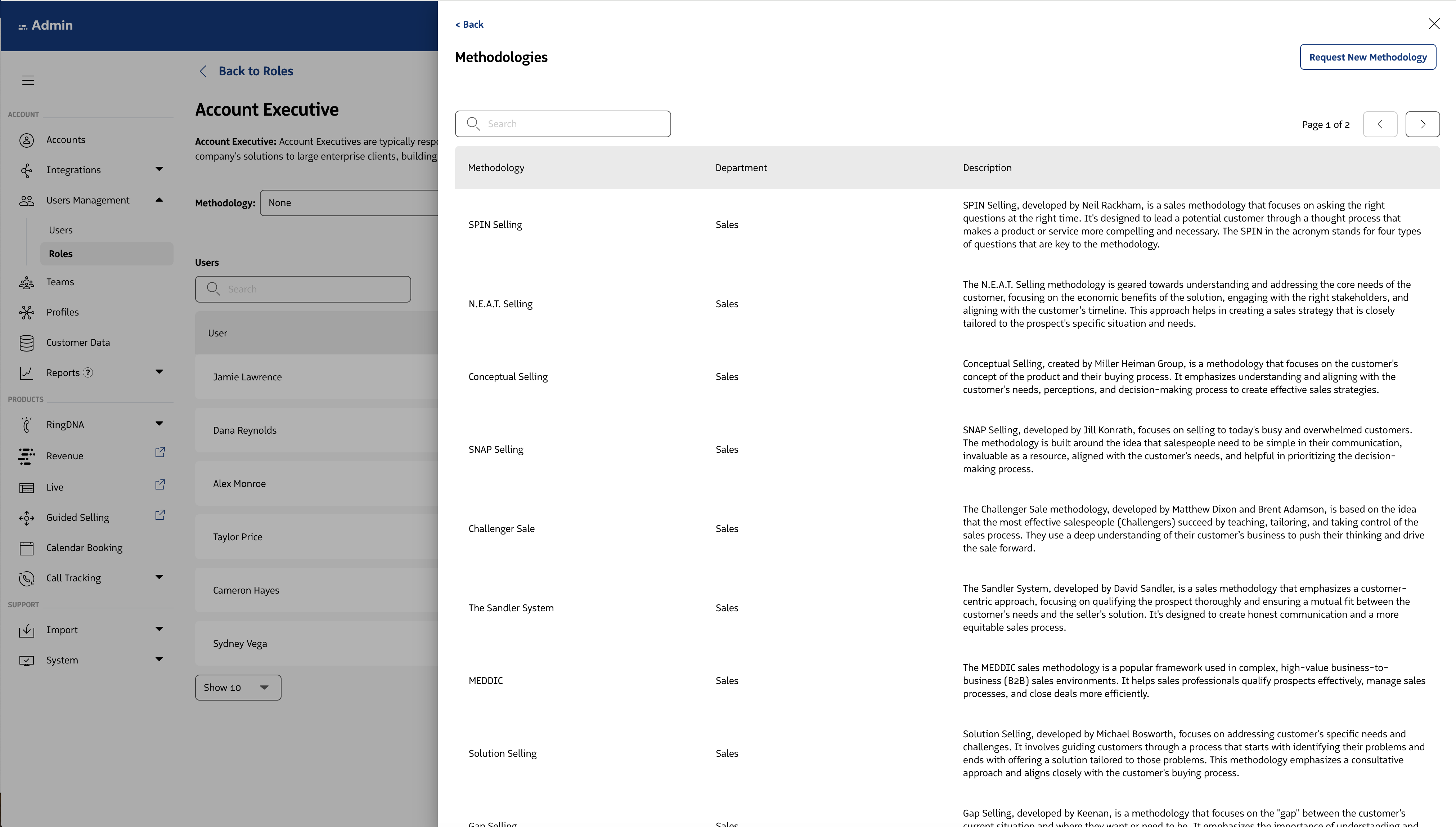 Within an individual role page, an admin can view and manage the methodology associated with the role along with the individual users associated with the role.