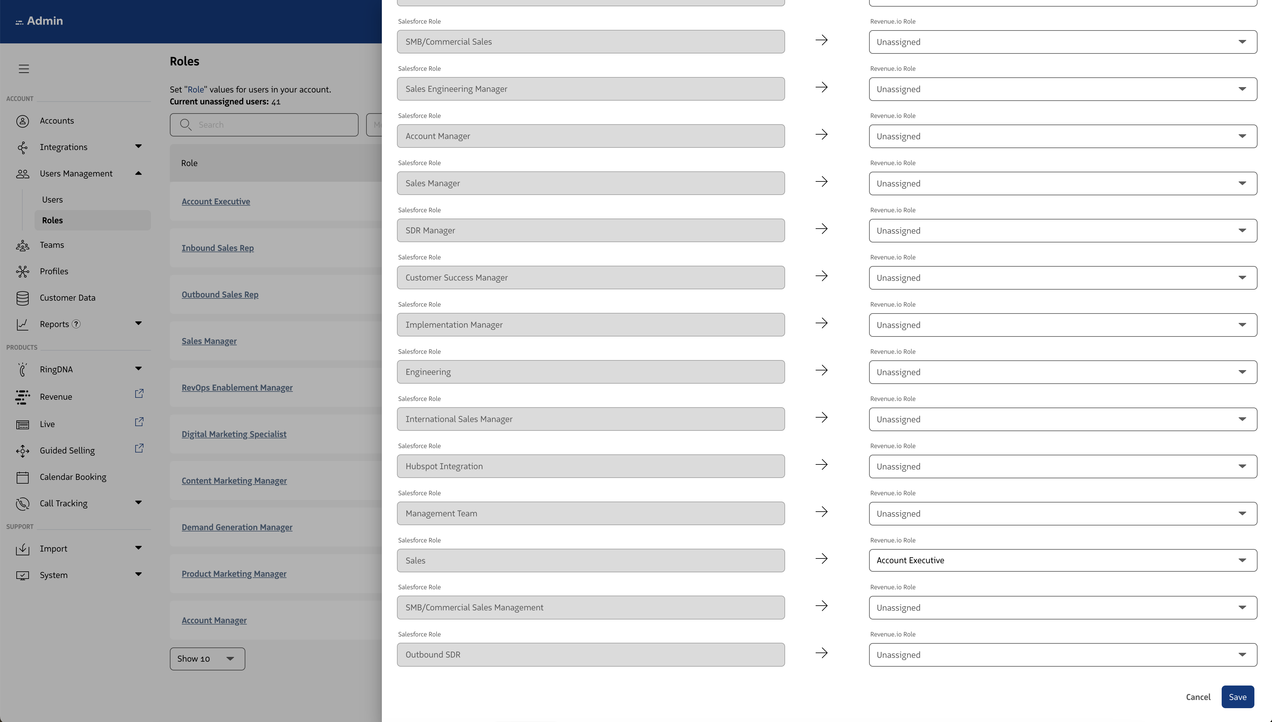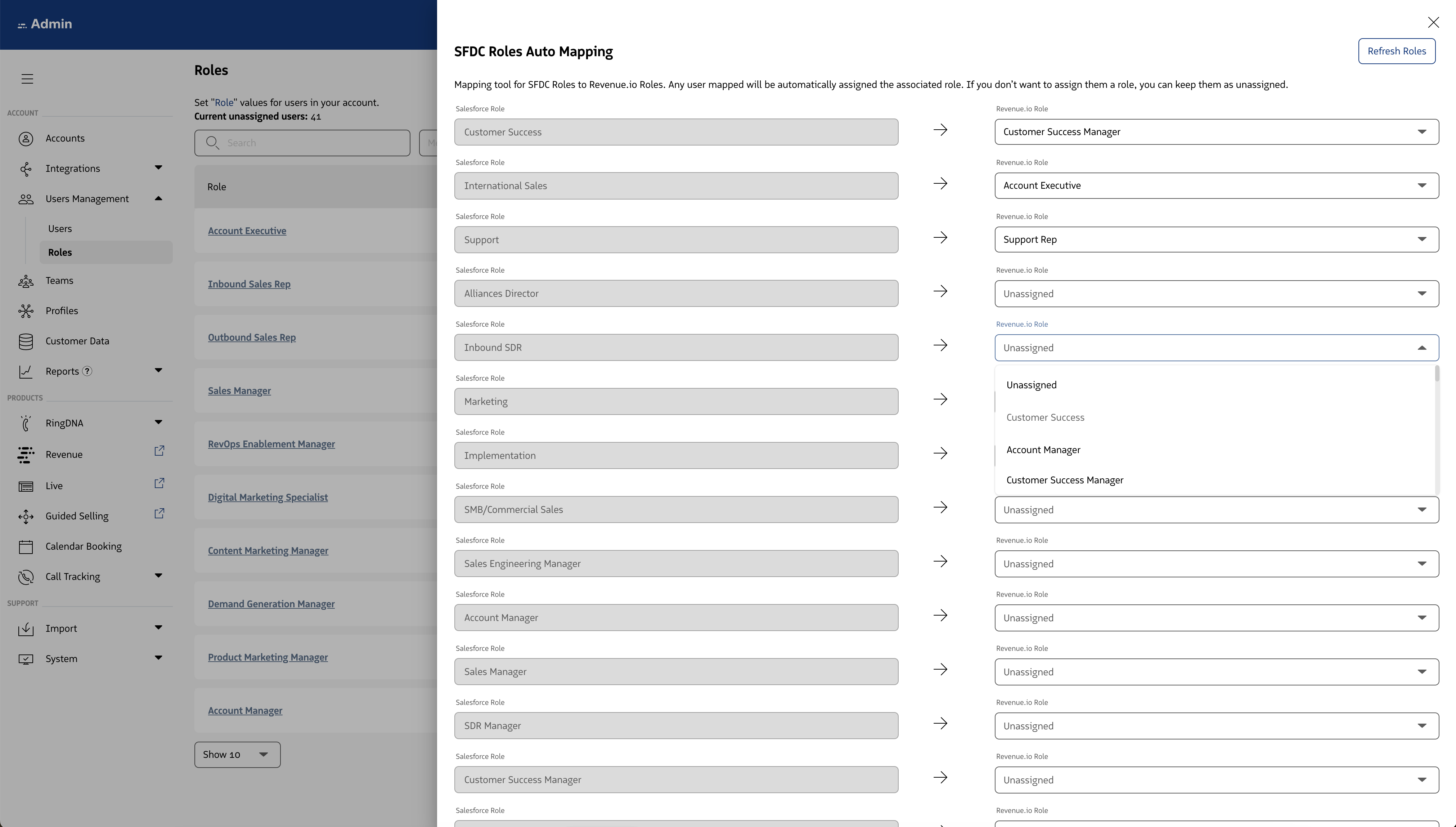 Associated with each of the detected Salesforce Roles is a picklist of Revenue Roles.