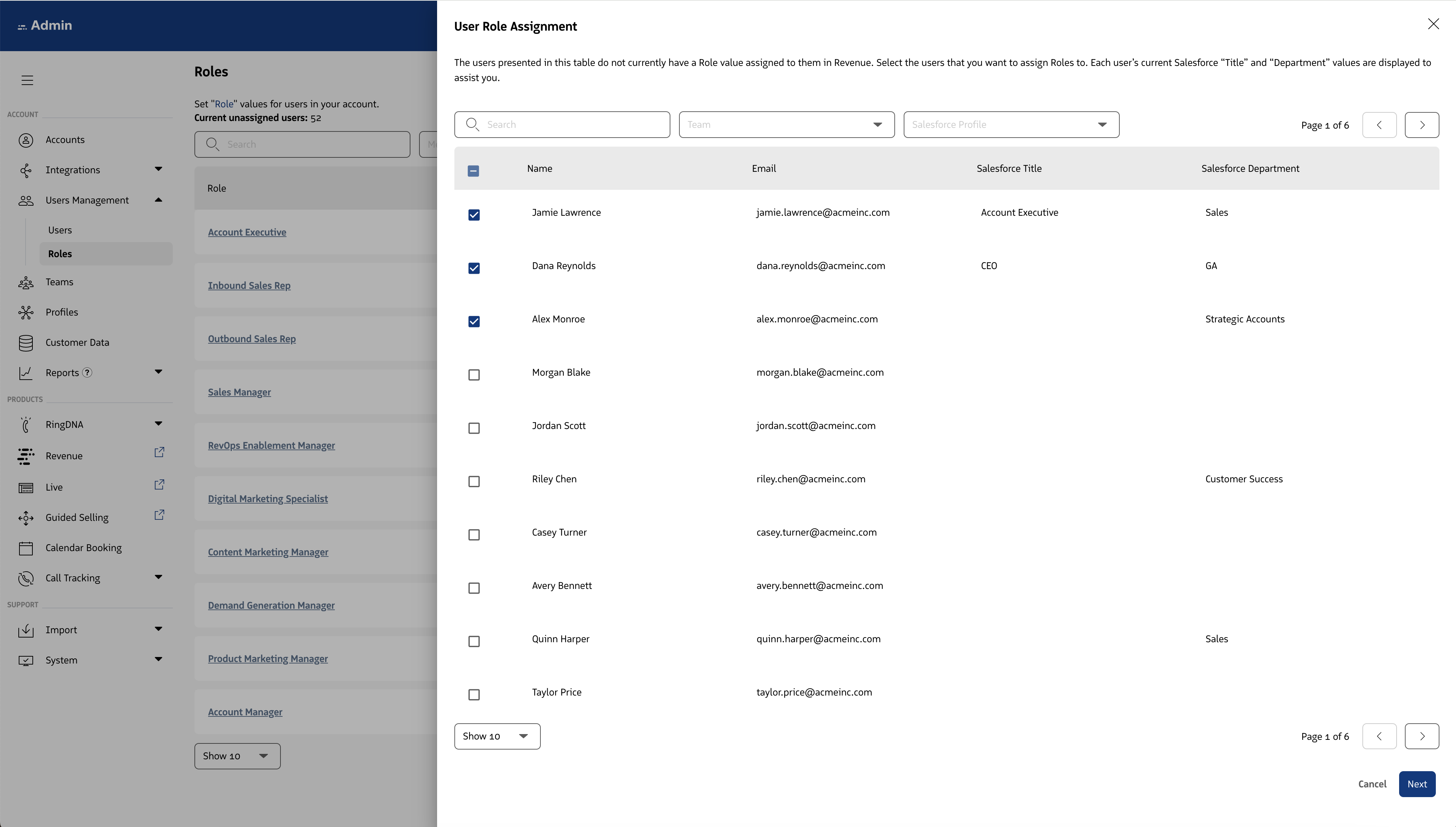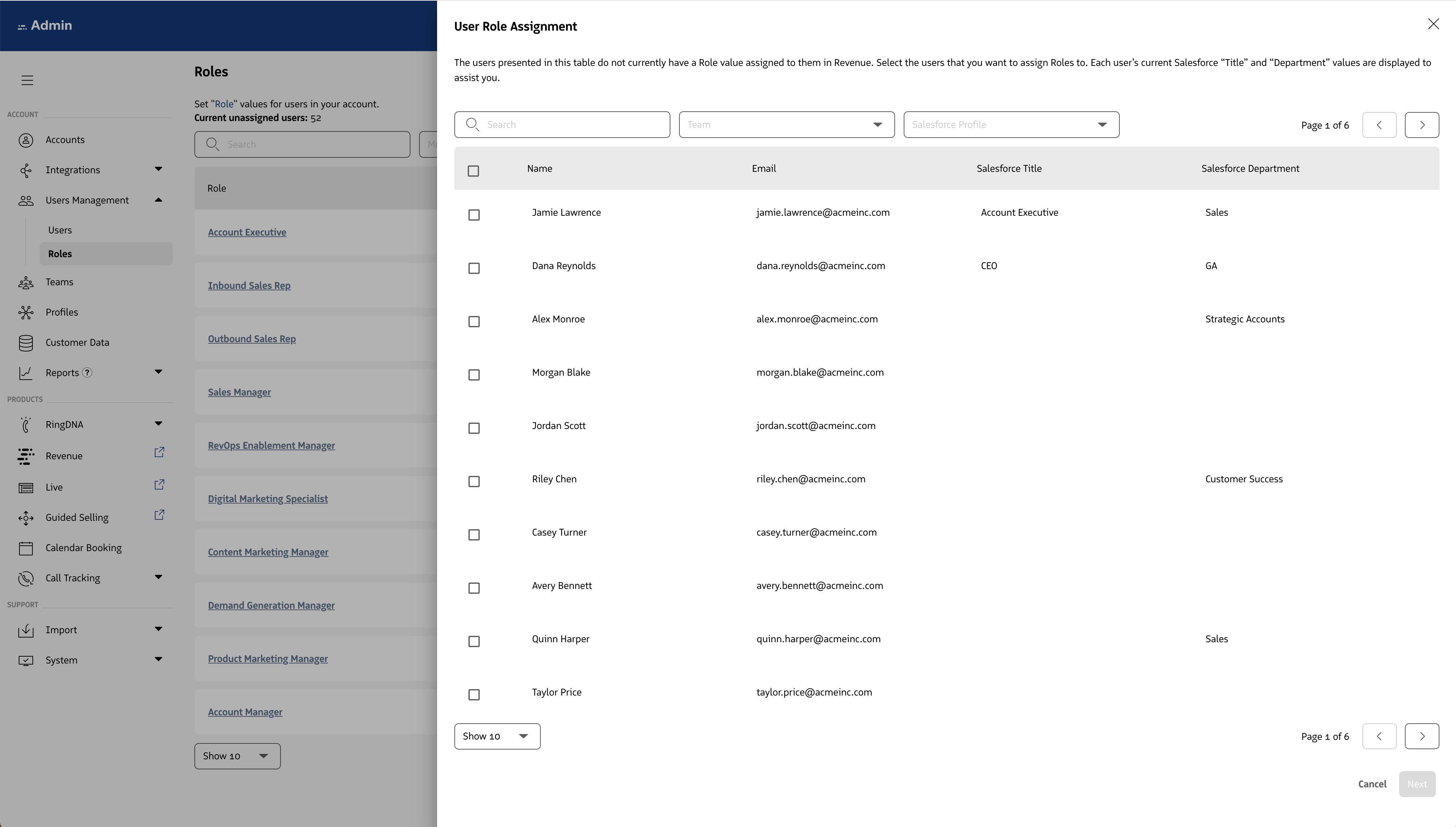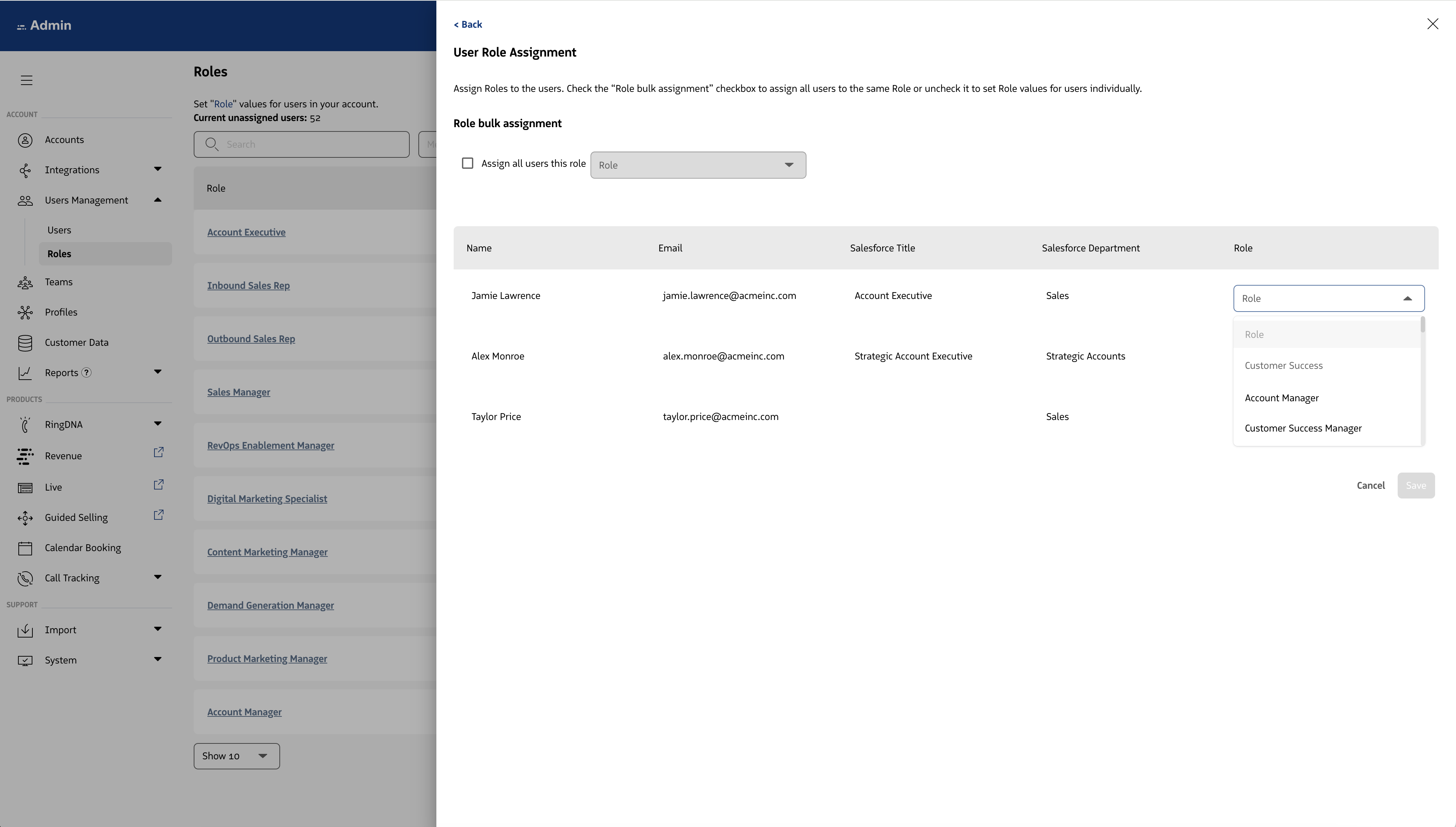 Locate the Salesforce Role that you want to map and select the dropdown associated with it. On selection you will be able to see a list of all Revenue Roles broken down by department. You can set the value of “unassigned” or select a Role from the list.
