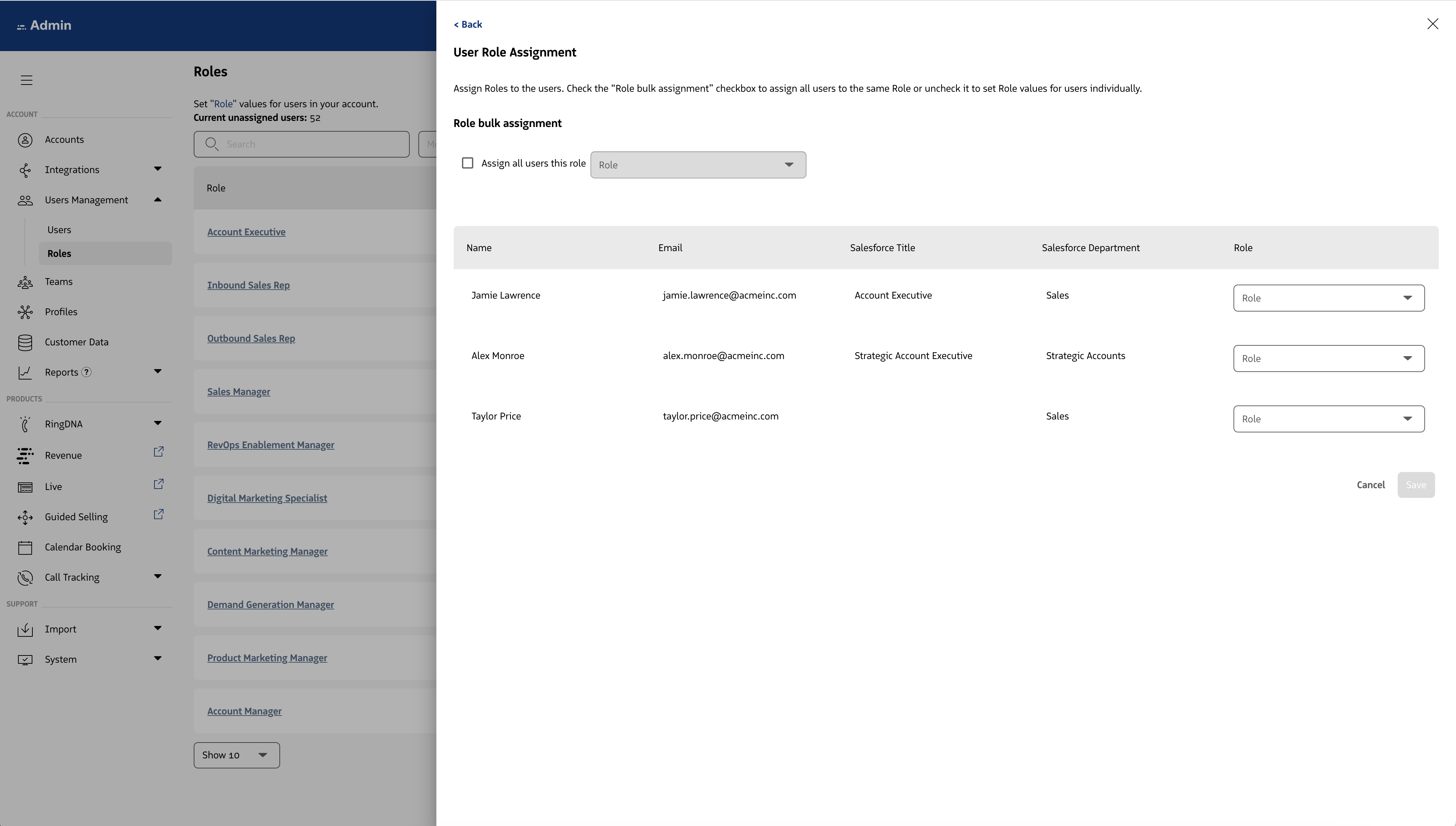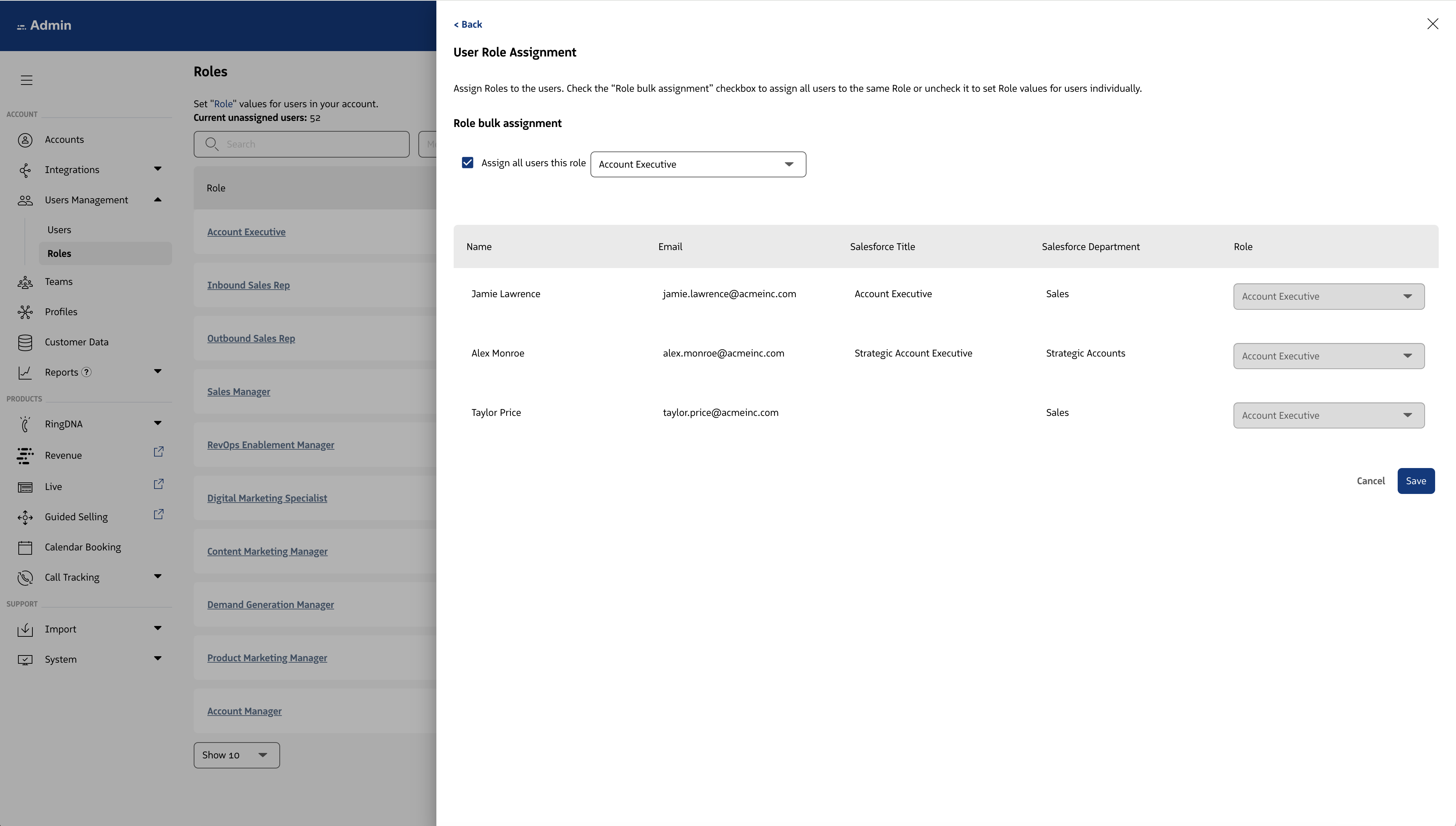 All users who are currently associated with a Salesforce Role will now be associated with the Revenue Role. On a go forward, any new Revenue User with a Salesforce Role that is created within the platform will assume the Salesforce Role based on the mapping set.